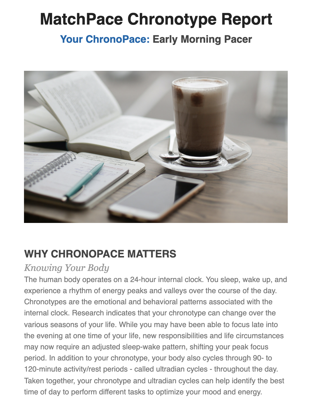 The ChronoPace is a powerful tool for helping you understand your unique working rhythm, your peak performance times, and when to focus or when to collaborate.